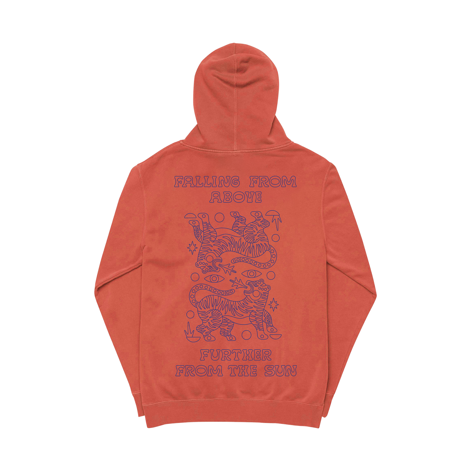 "Goose" design printed on the front left chest with a "From the Sun" design printed on the back of an amber colored pullover hoodie.