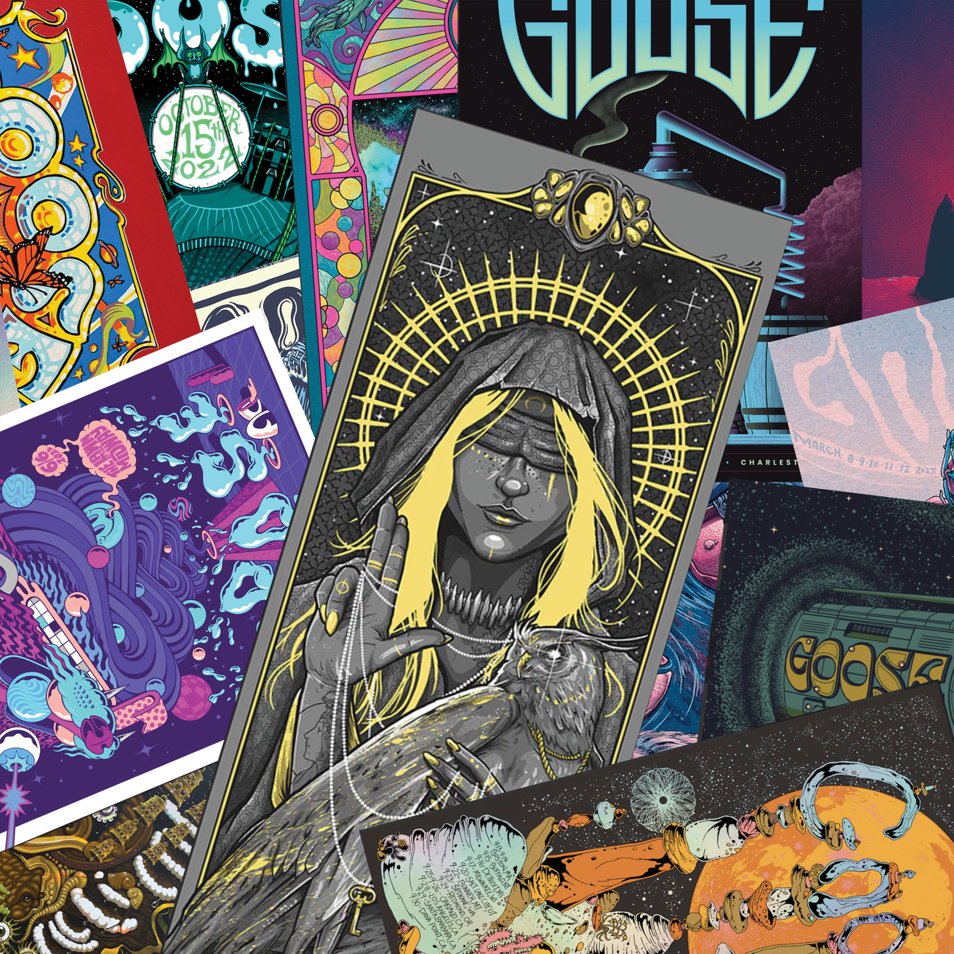 Tube of (3) random Goose posters. These may (but are not guaranteed to) include: foils, signed prints, and web variants – along with our standard versions sold on tour.