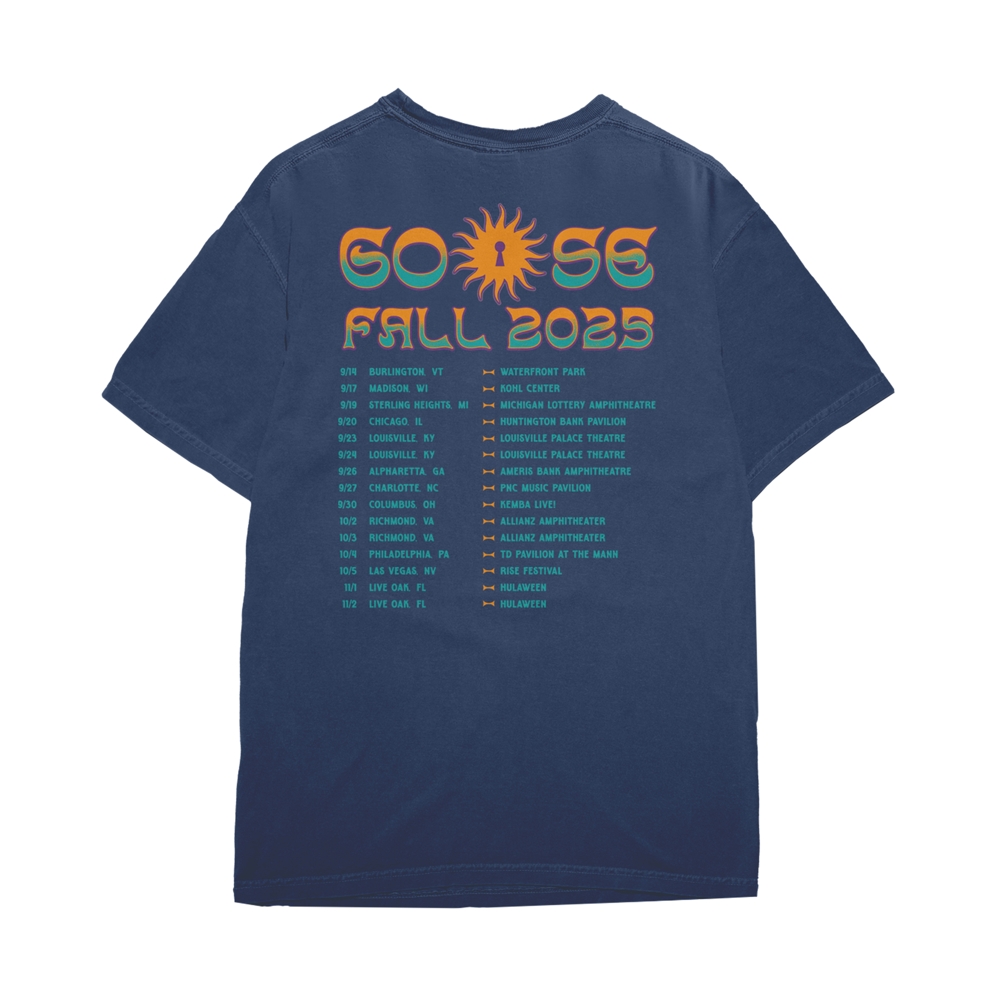 "Turbulence" design printed on the front with fall 2025 tour dates printed on the back of a navy colored 100% cotton t-shirt.